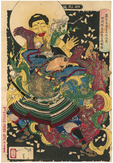 『新形三十六怪撰 蒲生貞秀臣土岐元貞甲州猪鼻山魔王投倒ノ図』