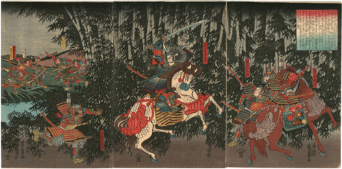 粟津ヶ原で木曽義仲としてありますが明智光秀が山崎の戦いに敗れ小栗栖での場面を描いた図です